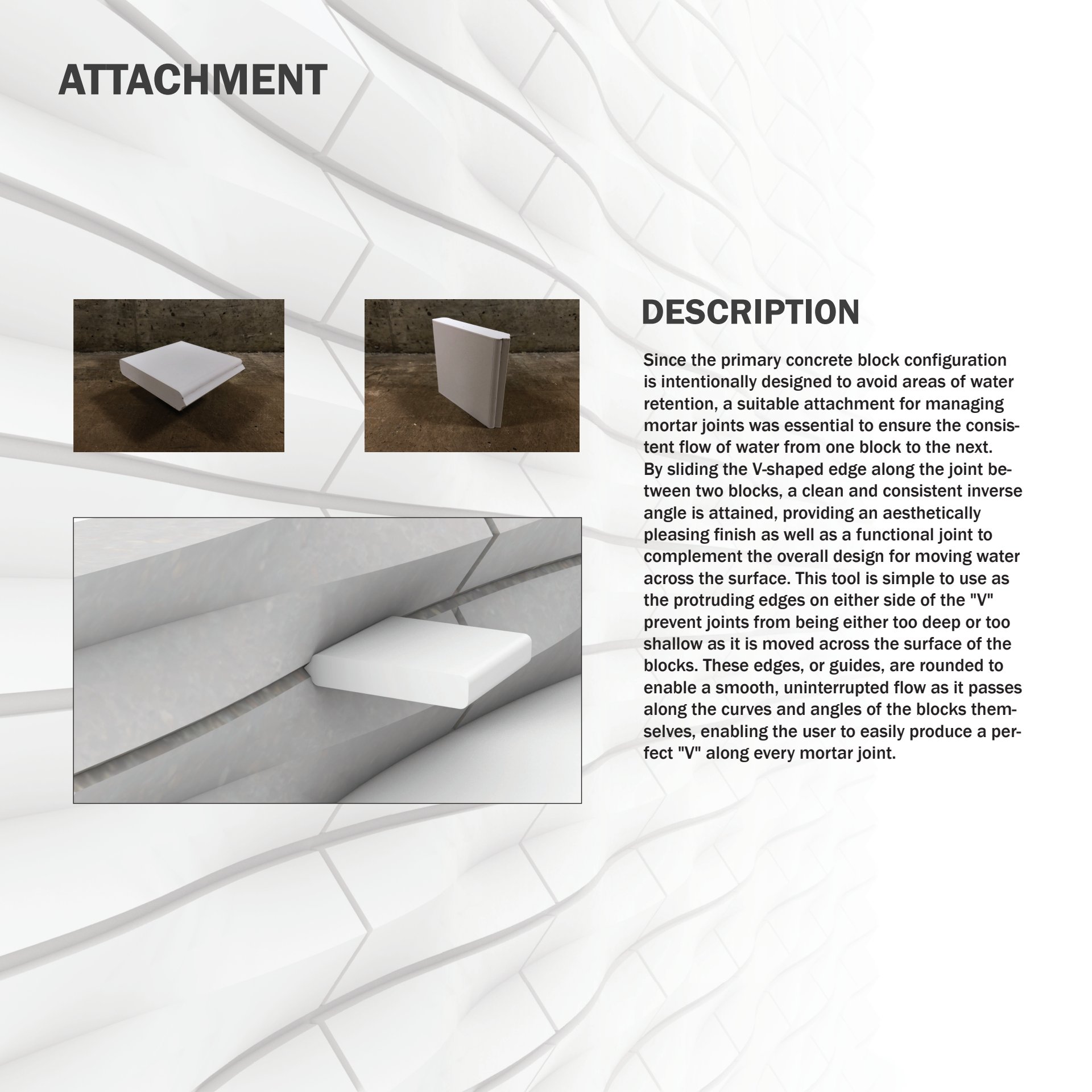 Our team focused on water deflection and creating a brick that through the use of one mold, could create three different wall designs just by changing the orientation of the brick. Each team member collaborated on the design but each member had their own unique parts in the making and construction of the components of the project. See below for more!